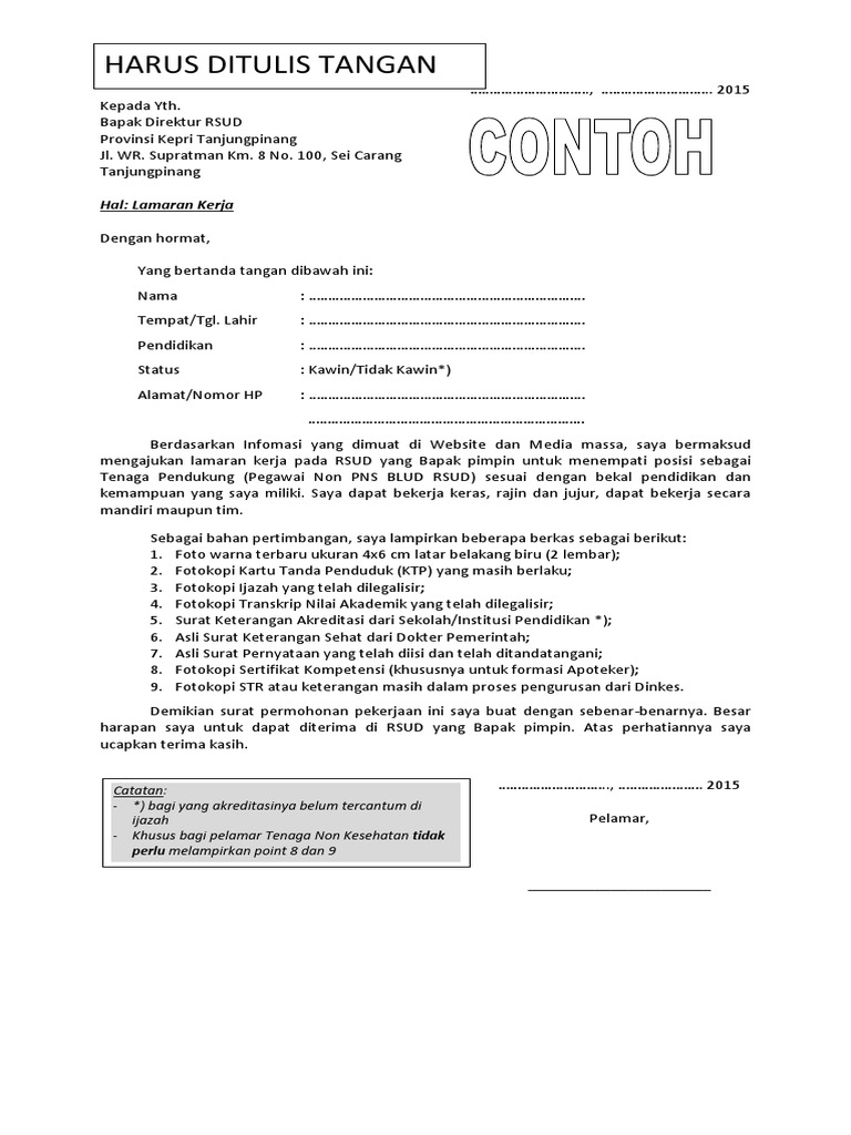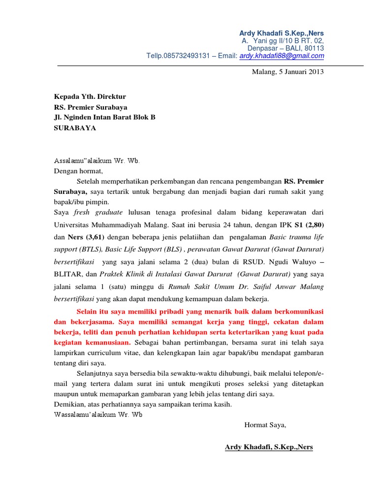 Surat lamaran kerja juga penting bagi kamu yang masih kuliah namun ingin magang di sebuah perusahaan untuk mendapat pengalaman. Saya doakan agar mendapatkan posisi yang tepat sesuai kemampuanmu. Akan tetapi, tak sedikit yang sulit membuatnya mengingat banyak faktor yang harus diperhatikan. Delman 3 rumah sakit no.111 rt/rw 011/114 cengkareng barat, cengkareng jakarta barat mobile phone: Berikut ini beberapa contoh surat lamaran kerja di rumah sakit lengkap serta bentuk.doc nya.